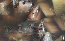 调入盐、老抽、蚝油、糖、南乳、十三香炒至猪蹄上色,烹少许料酒翻炒均匀