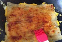 翻面刷辣酱,依据自己口味还可以放醋和糖,或者其他酱料哦,我放的蒜蓉辣酱
