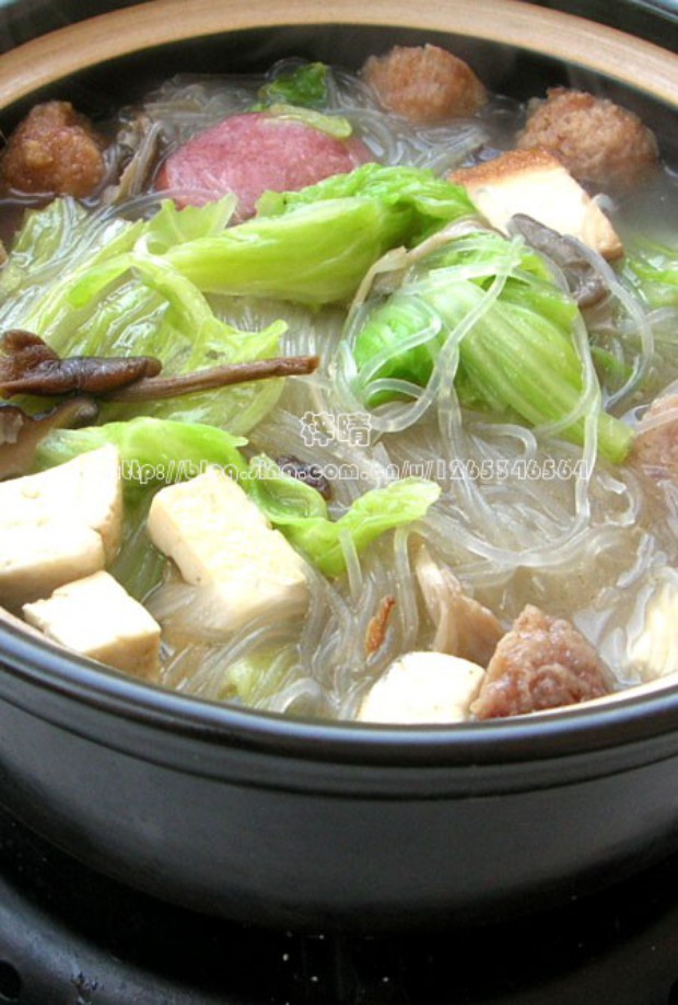 5. 依次加入白菜、粉丝,因为都很易熟,略煮转入砂锅中即可