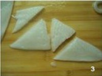 将切完花刀的鱿鱼,按第二次切的纹路间隔切成三角块