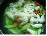 倒入氽过水的鱿鱼,加入,盐、鸡精、蚝油、白胡椒粉,炒匀后即可出锅盛盘