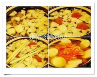 沙锅之内注入冷水,将牛腩放入,依次放入酸汤,番茄酱,香茅草,洋葱,干辣椒,生抽大火烧开后小火炖60分钟,然后加入白萝卜,生番茄及盐,继续炖20分钟即可出锅