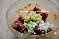 将步骤2中的调料和适量盐,加进肉里,用手拌匀,务必使每一块肉都能抹上调味料