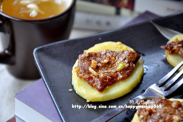 烤箱预热到200度。烤盘铺上铝箔纸,码上土豆片,再在土豆片上码上一块牛肉。多余的腌料可以抹在肉上。入烤箱中层,200度,上下火,12分钟。——烤完了,发现土豆有点粘,建议可以先在铝箔纸上刷一层薄油,再放土豆,就OK了