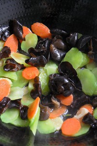 依次下入胡萝卜、黑木耳、莴笋大火翻炒断生。