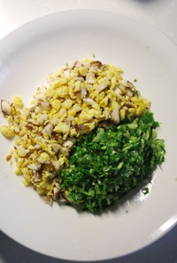 青菜和香菇洗净后,控干水分,切碎、玉米煮熟,将粒剥下来。鸡蛋打散、热油下锅炒熟,铲碎。