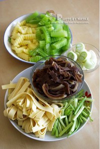 虾处理干净,土豆、莴笋去皮切块,豆腐皮、牛百叶切丝,芹菜切段,葱切段,姜切片