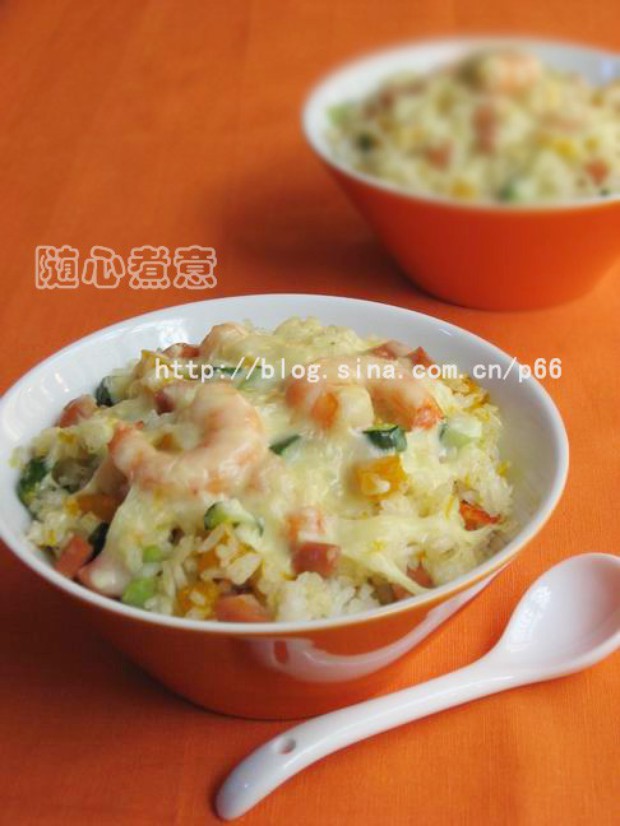 将炒好的米饭盛入碗中,撒上乳酪丝,放进预热180度的烤箱烤约5分钟,至表面金黄即可