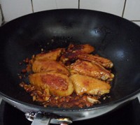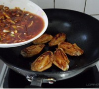 等鸡翅两面都煎成金黄色,把腌制鸡翅的调料倒在鸡翅上