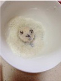 椰蓉放小碗里,搓好的奶酪球放椰蓉中滚动,沾一薄层