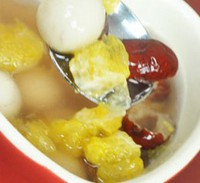 水开时,放入搓好元子入锅,煮熟,后加入橙子肉,在煮上一会