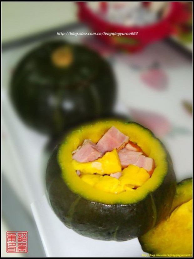 3. 将切好丁加鸡汁调味,重新放回到南瓜盅里