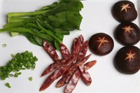 菜心去根部的硬皮,香葱切末,广东香肠斜刀切片,香菇欹花刀