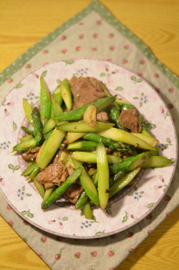芦笋是一种灰常有营养的蔬菜哇,但是价格也是灰常的不亲民的说。简简单单的跟牛肉一起炒,保留了芦笋的鲜味,和一点点淡淡地甘甜。非常好吃。