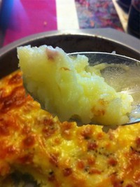4. 土豆泥入烤盘,放入3,放入牛奶。搅拌均匀。
