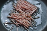 取少许煎火腿丝的油,抹下锅底,取适量土豆丝,要煎大的就多点,小的就少点
