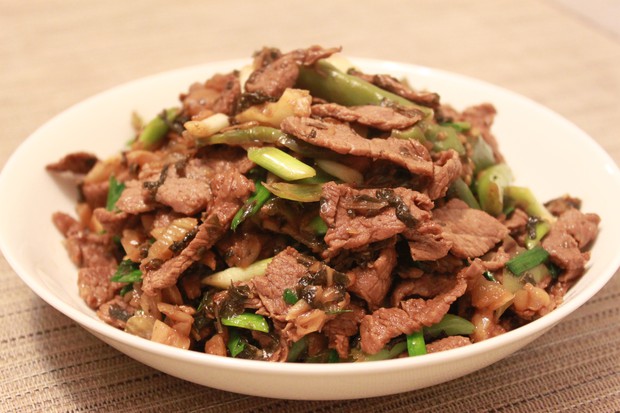 放牛肉翻炒变色,与酸菜合匀翻炒,使之相互串味