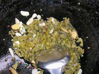 同时将炒锅洗净置火上,放油烧至六成热,放入泡辣椒碎小火炒出香味