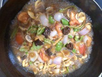 洗干净锅,加两大勺了的油烧开,依次加入生姜,番茄,蘑菇,洋葱和辣椒,翻炒一下,加入提前烧好牛肉,加入适量的盐,一小勺子的老抽。盖上锅盖,烧上两分钟就可以了。打开锅盖,加入少量的胡椒粉,喜欢吃味精的也可以加点,这样这全部OK了。