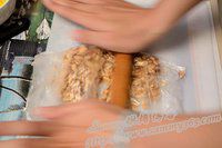 炒熟后将花生用粉碎机打碎(不用打的太碎,以保留花生的口感),如果您没有粉碎机可以像Sammy一样,把花生放入塑料袋内,用擀面杖把花生压碎~