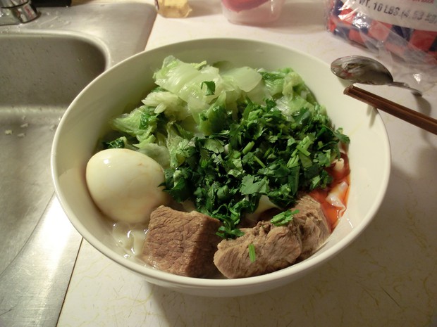 面盛到碗里,把汤倒进去,白菜铺好,牛肉块铺好,找个地方把茶叶蛋放上,切好的香菜撒上,倒上辣椒油