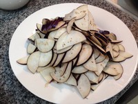 茄子切片,不要太薄易碎,也不要太厚浪费油。