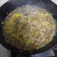 加入开水(刚没过蔬菜为宜),待洋葱和卷心菜充分熟透后,倒入鸡蛋液。(图片重水加多了点,味道有点寡淡)