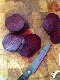 甜菜根洗好,放于水中开大火煮沸后,转中火煮40-45分钟。 用筷子很容易戳入其中,就是煮好了。去皮