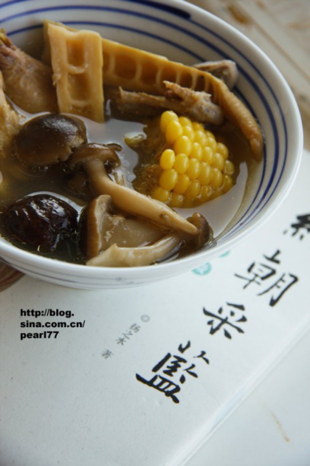 加入蟹味菇、竹笋、玉米、蜜枣继续煲2-3小时