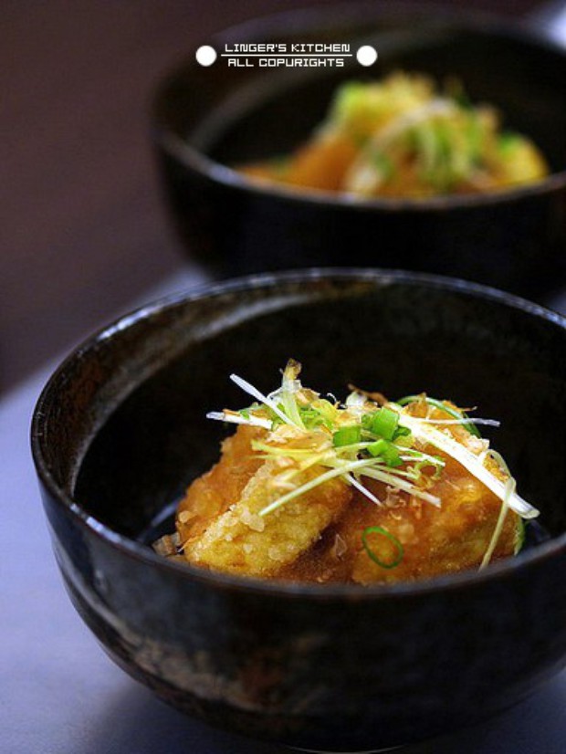 将炸好的豆腐放在容器中,加入蘸汁(萝卜泥与调味后的出汁拌匀),放上葱丝和葱花,撒上木鱼花碎,豆腐和着蘸汁一起吃即可