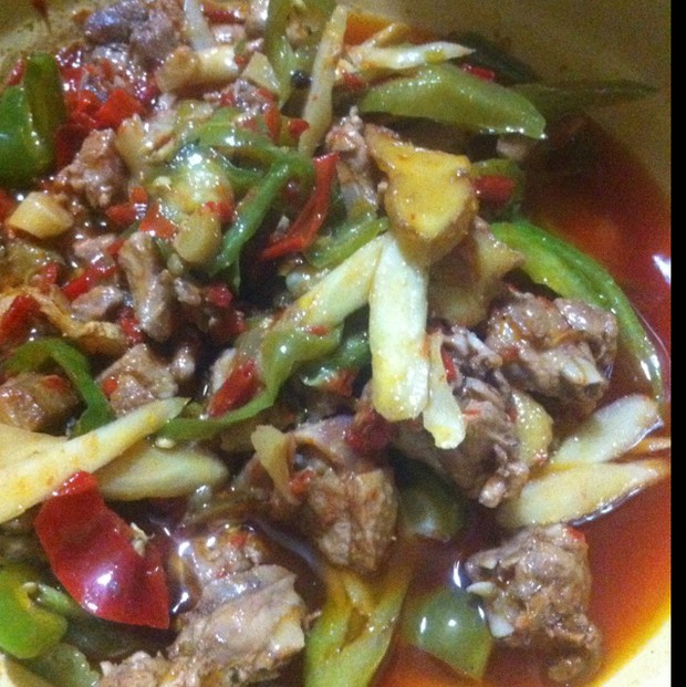 加适量水没过鸭子,点少许醋。烧至汤汁收干或浓稠。放入仔姜和青椒翻炒,放少许盐调味。出锅!