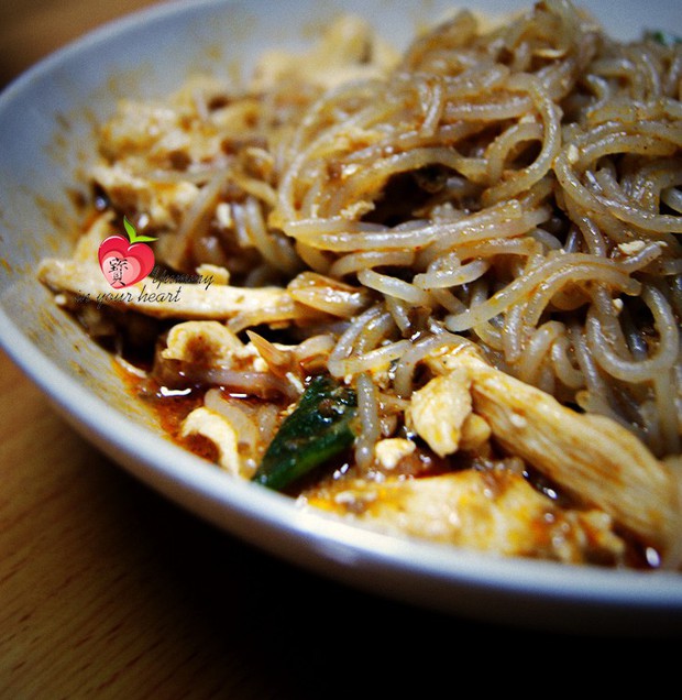 加入鸡肉片翻炒至半熟,加入粉丝,沙爹酱,盐,少量水