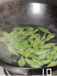 刀豆斜切成菱形,入开水锅焯熟。(可加少许盐,保持翠绿的颜色)
