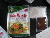 打开麻辣蒸肉粉,取出调料包和米粉包