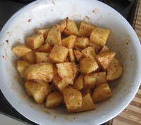 土豆中加入1/5的米粉个刚才剩下的调料包,加少许盐,搅匀,扑在准备蒸的碗底