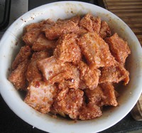 排骨中倒入料酒、花椒粒、豆瓣、酱油、4/5的调料包,腌10分钟
