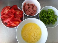 西红柿切小块,香肠和尖椒都切片,鸡蛋打散