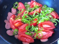锅中再放入少许油,把准备好的西红柿、香肠和尖椒放入锅中煸炒