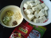 先将各种原料准备好。葱、姜、蒜切末,豆腐切块。