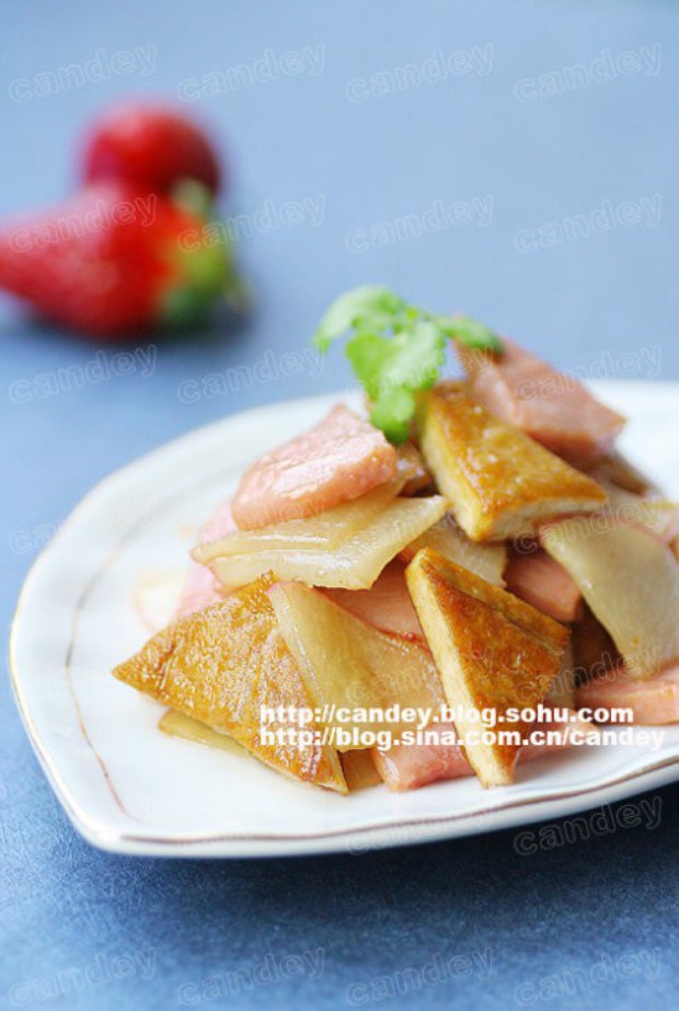 火腿油煸后不光味道好,而且它的鲜味渗入炒菜的油中,会给其他配料提味儿.