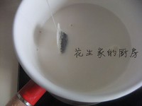 无油的锅(不粘锅最好)加热牛奶。滚开会悬入一袋儿红茶(如果你用的是茶叶的话,一会儿就要过滤一次)不断地上下抖动、浸泡茶叶包。尽量使茶料能够充分释出。