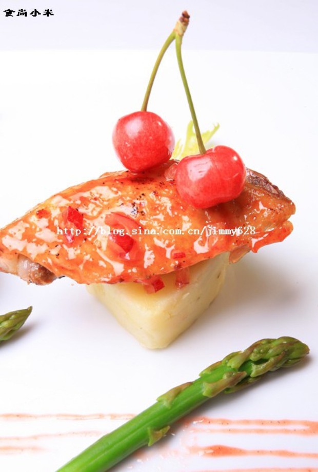 芦笋去皮切段在开水中放入黄油盐,煮透捞出装盘,放上鲜樱桃点缀,其余酱汁挤在盘中即可