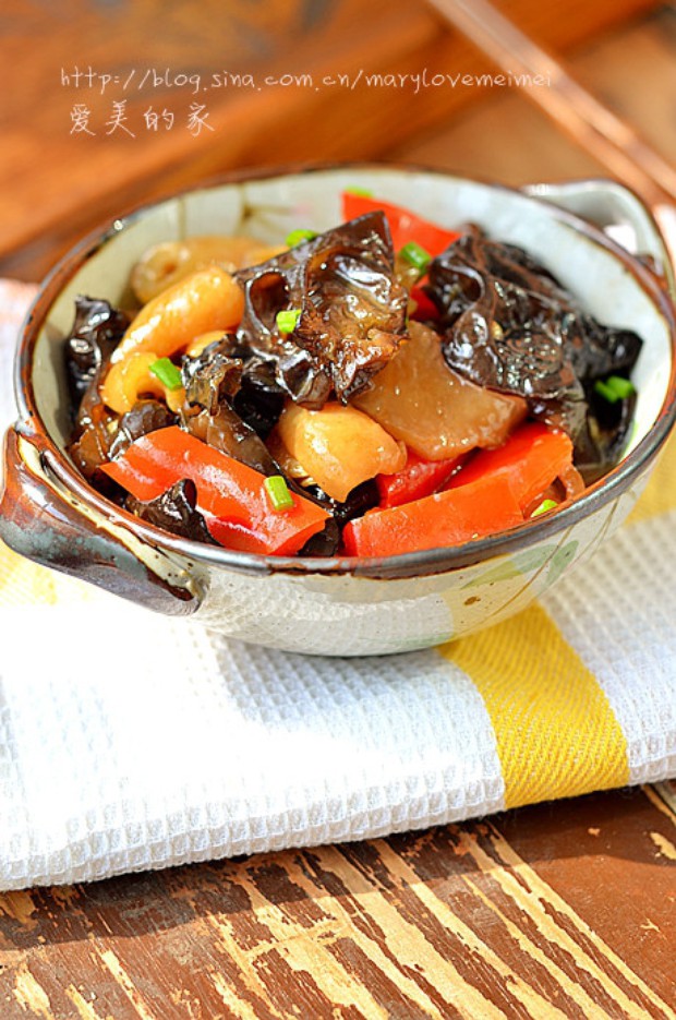 待汤汁收浓后将切好的红椒片拌入翻炒均匀,撒少许香葱碎出锅
