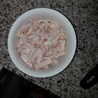 2. 把猪肉皮上的毛清理干净,切条后用清水漂一遍。沥干水后放进8成热的油锅里炒软后再倒入辣椒一块炒!
