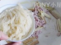 今天给大家献上这道清新雅致的菜。这道菜里用了江南人喜欢吃的肉皮,这肉皮是猪肉皮,晒干后油炸再在水里泡发切成丝做菜,口感是非常好啊!猪皮之所以味道鲜美,是因为猪皮含有丰富的营养。
