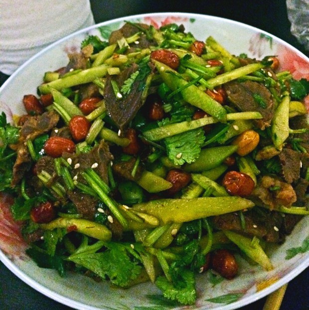 将所有材料放入大盆,加入凉拌生抽或者海鲜酱油,香醋,麻油,辣椒油,一点芝麻,狂拌(料要一点点加,慢慢试自己喜欢的味道),简易版夫妻肺片就完成啦