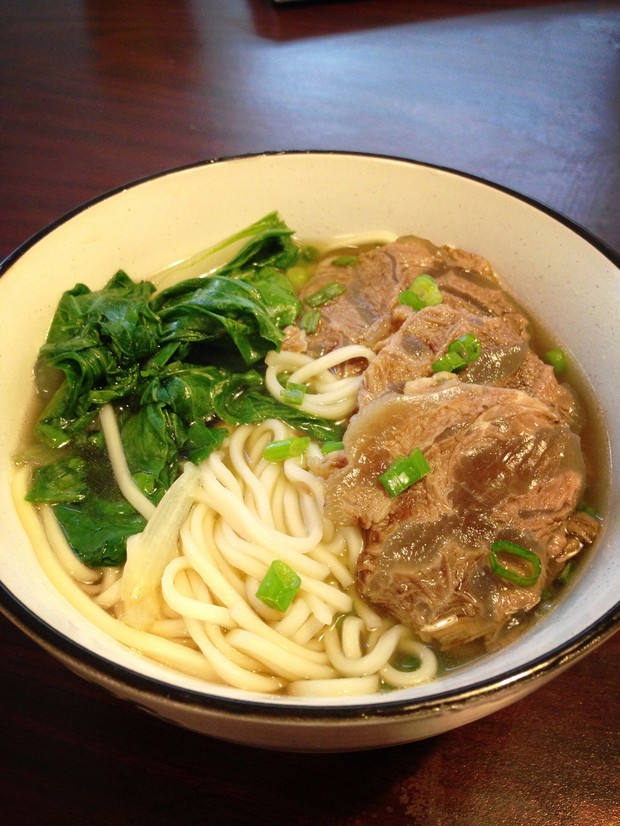 锅里放两勺之前炖出来得清汤,放一把青菜,青菜略熟得时候丢进去面和切好片得牛肉