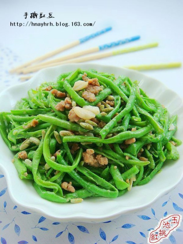 用锅内剩的底油,加蒜末爆香,放入豆角,翻炒2分钟。再放入炒好的肉馅,再调入盐,鸡精出锅即可