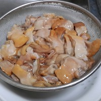 烧开水,将蚌肉快速烫熟、焯水,再次清洗,沥水。