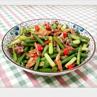 蒜苗颜色变深时倒入蚌肉,翻炒。